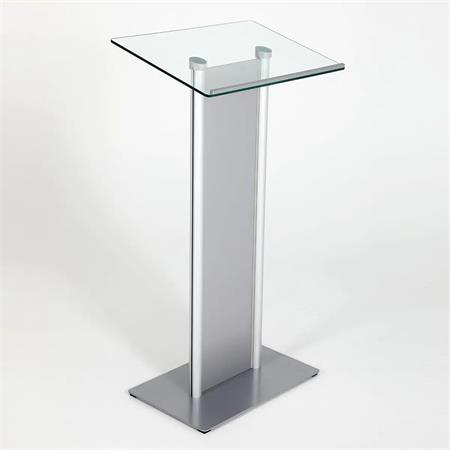 Az üveg felső résszel és fém előlappal ellátott előadói pulpitus elegáns és modern megoldás konferenciákhoz, előadásokhoz és rendezvényekhez, akár kültéri használatra is.